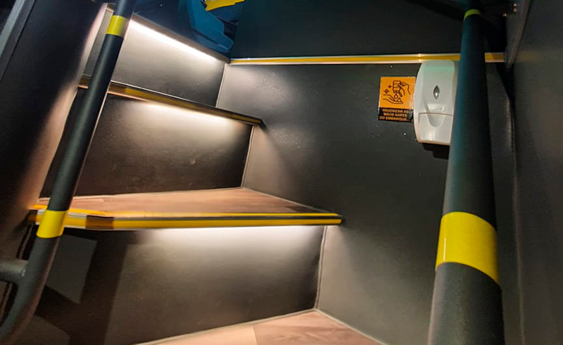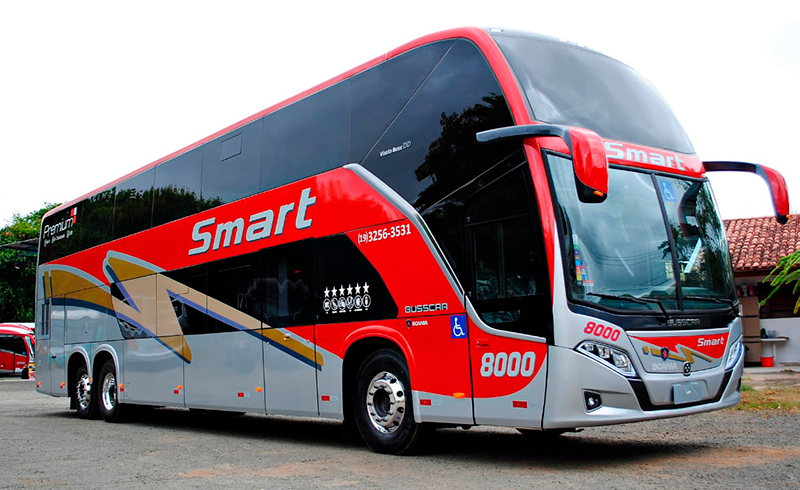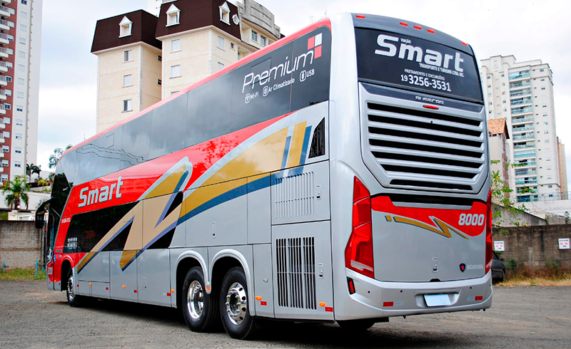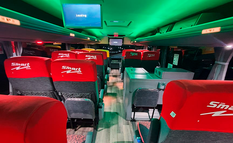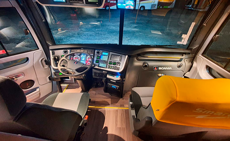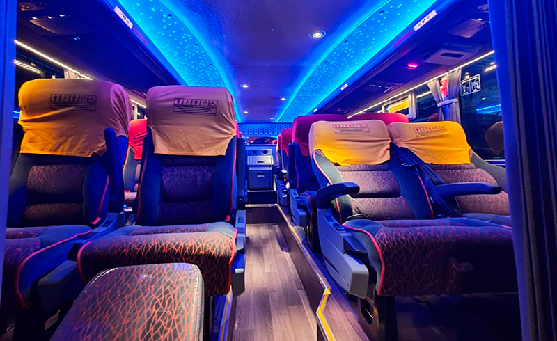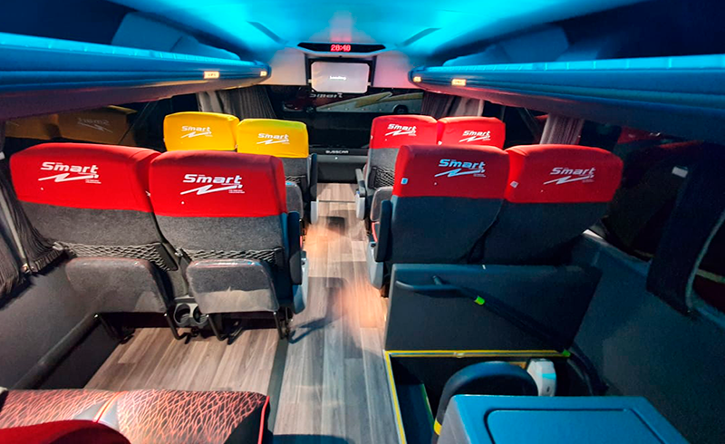 44 lugares Semi leito turismo piso superior. 16 lugares Semi leito turismo piso inferior. Bancos soft reclináveis com descanso de pernas e entrada USB em todas poltronas. Ar condicionado ecológico. Iluminação piso superior com cromoterapia. Iluminação piso inferior com cromoterapia. DVD. Monitores 3 de 15” e 1 de 23” piso superior 1 de 23” no piso inferior. Som ambiente. Wi-Fi - 4G. Microfone. Banheiro.
